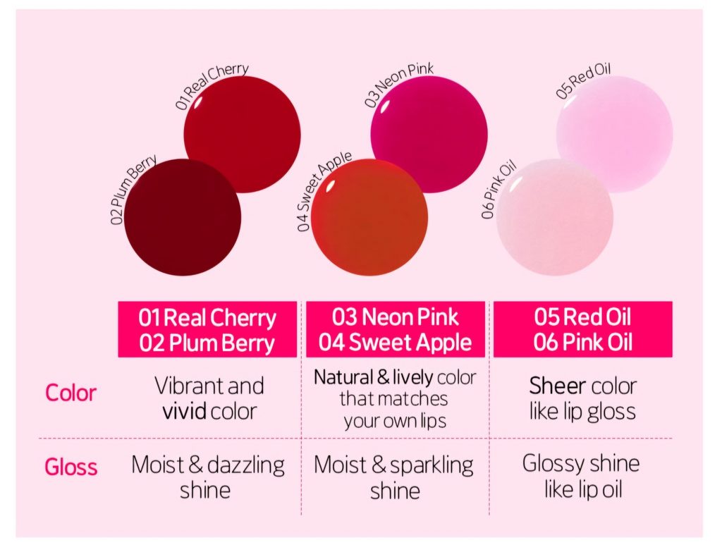 Tint łatwy w aplikacji, tworzy błyszczący i soczysty wygląd ust, nie wysuszając ich.