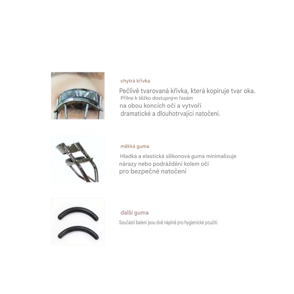 Zalotka do rzęs z miękką podkładką i profilowaną krzywizną zapewnia wyraźne, delikatne i długotrwałe podkręcenie rzęs. Chwyta rzęsy u nasady, optycznie otwiera spojrzenie. W zestawie znajdują się także 2 zapasowe podkładki.